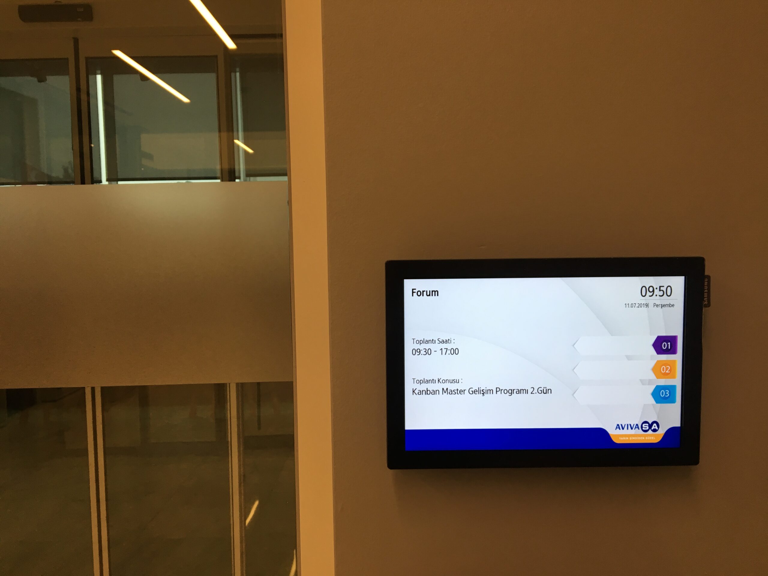 • Toplantı odası girişlerine konumlandırılan 10” ekranlarda odanın müsaitlik durumu, mevcut toplantı bilgisi ve zaman planlaması gibi detaylı verilen ekrandan takip edilebilmesi sağlandı.