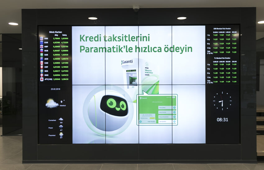 Garanti Bankasının yoğunluk yaşanan çeşitli şubelerinde müşterilere kolayca ulaşılmasını sağlayan kurumsal yayın sisteminin oluşturulması hedeflendi. Gişe arkasına bulunan VideoWall sistemlerinin iDisplay çözümleri ile yenilenmesi ve Garanti Bankası’nın yenilenen VideoWall sistemlerinde kurumsal yayın yapabilmesi amaçlandı.
