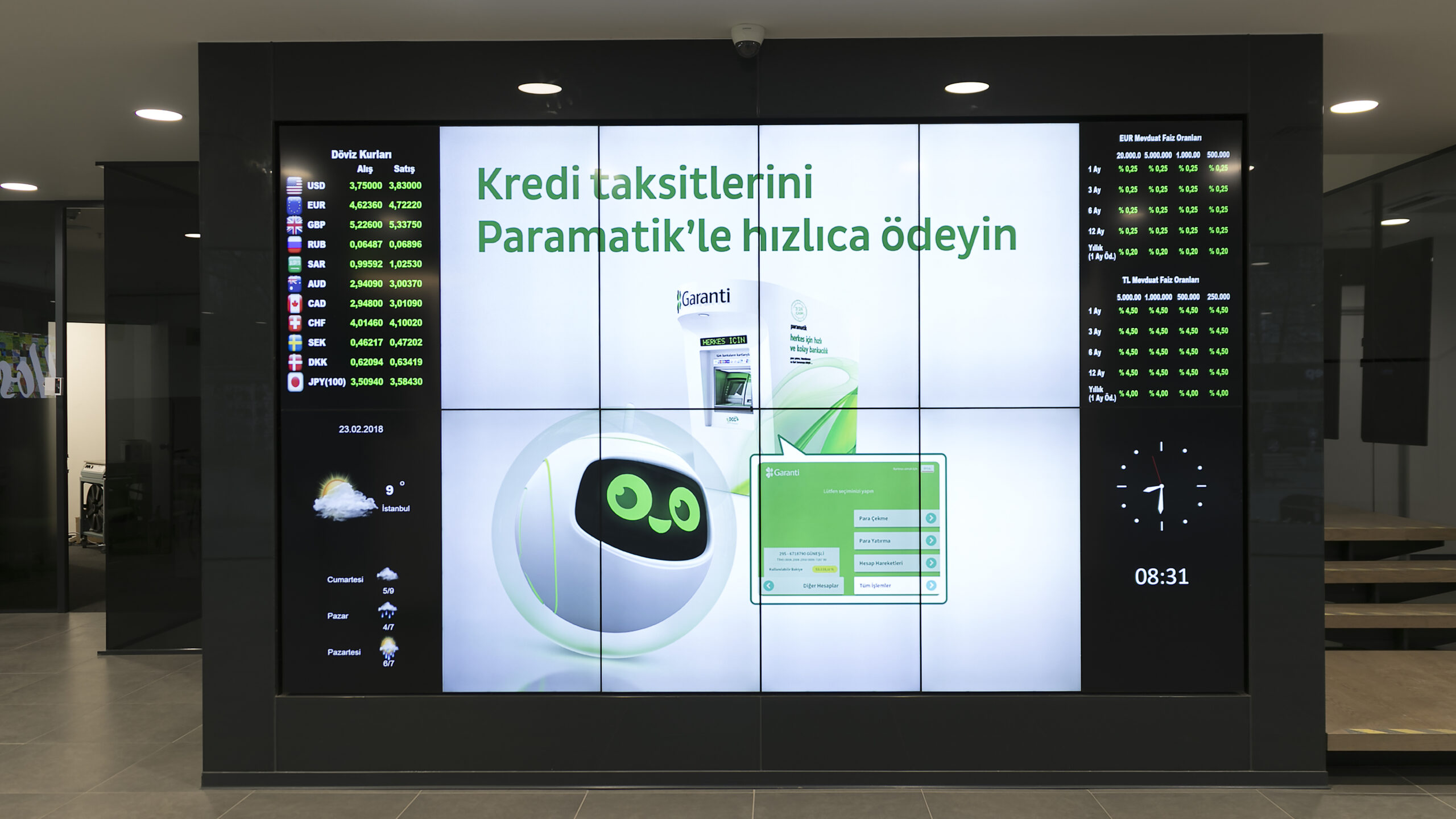 Garanti Bankasının yoğunluk yaşanan çeşitli şubelerinde müşterilere kolayca ulaşılmasını sağlayan kurumsal yayın sisteminin oluşturulması hedeflendi. Gişe arkasına bulunan VideoWall sistemlerinin iDisplay çözümleri ile yenilenmesi ve Garanti Bankası’nın yenilenen VideoWall sistemlerinde kurumsal yayın yapabilmesi amaçlandı.